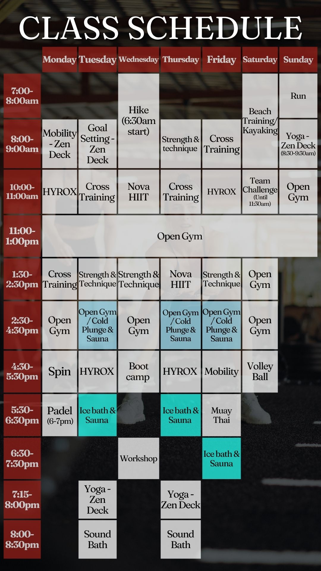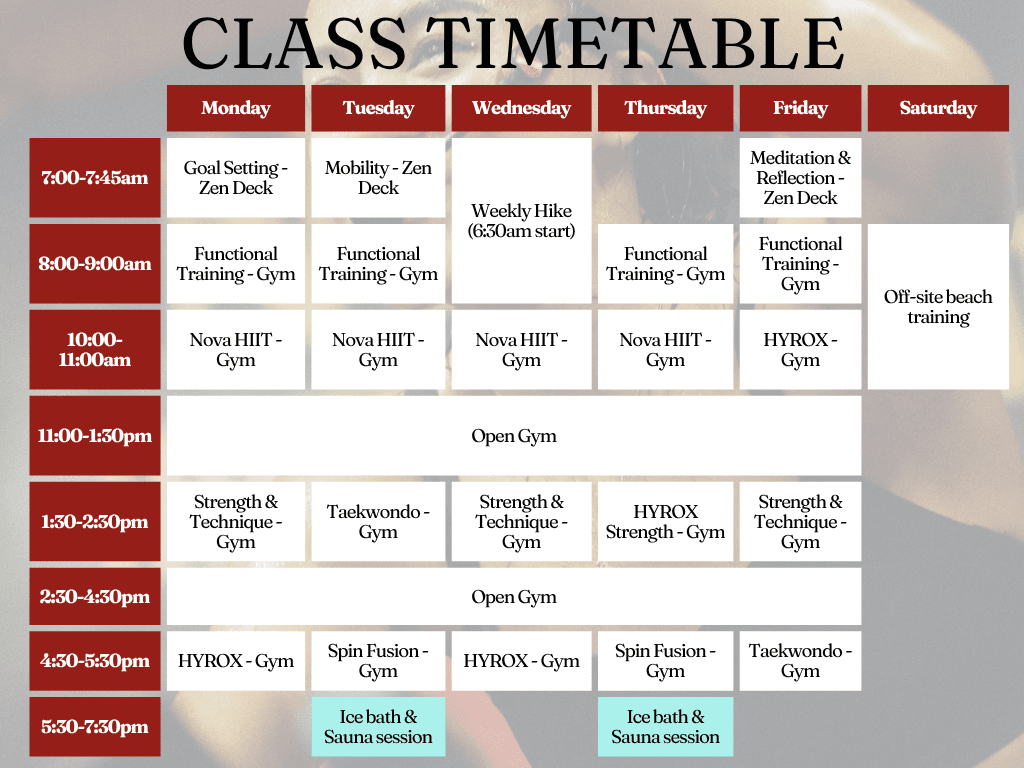 Our timetable includes strength, conditioning, HYROX, mobility, recovery blocks, and outdoor sessions. Structured across the gym, Zen Deck and training zones.